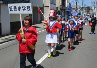 小学校の中では、飯豊小学校がトップで役場前をスタートしました。
