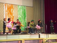 小学校に入学して7か月の1年生。これまで音楽の時間に練習した曲と合わせて様々な 曲を歌ったり、演奏したりすることができました。キラキラテープやリボン・蝶ネクタイをした1年生の子どもたちがステージ上で目を輝かせて動き回っていました。