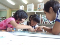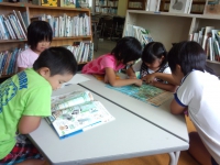 新刊本を集めたコーナーで新しい本に目を輝かせる子。自分が読んだおもしろい本を友達に紹介する子。絵本の表紙に目をひかれて読み始める子。子ども達それぞれが楽しい図書室でのひと時を過ごしていました。