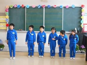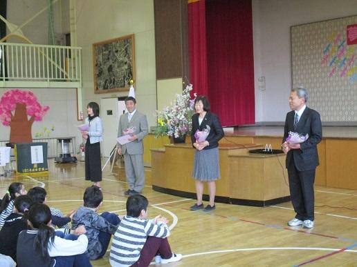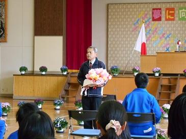 離任式では、退職・転任する4名の先生方の紹介を行い、子どもたちへひとりずつあいさつをしました。