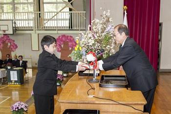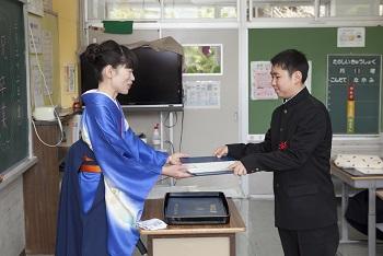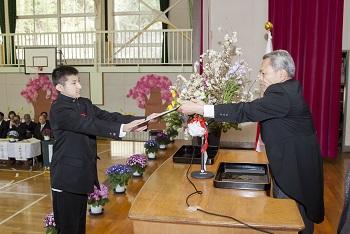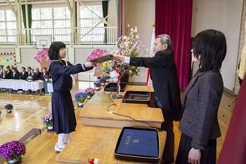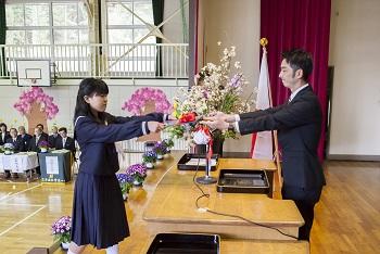 9名の卒業生の入場から始まり、校長先生から卒業生一人ひとりに卒業証書が授与され、卒業生はとても立派に証書を受け取りました。