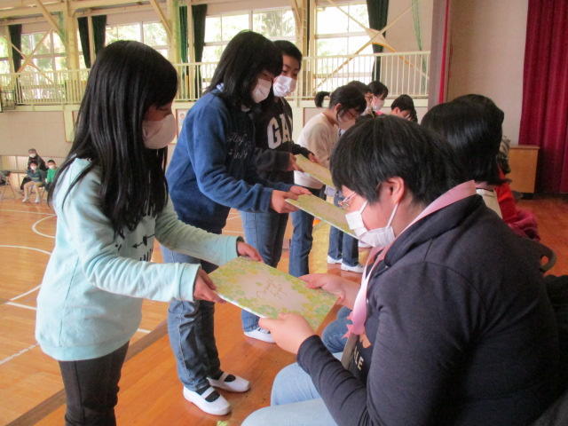 手作りの似顔絵入りのメダルやメッセージの入った色紙が、在校生から6年生へプレゼントされました。