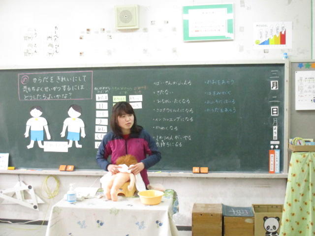 授業の後半では、「顔を洗う」「歯をみがく」「おふろに入る」「体を洗う」など、手を洗うだけでなく、自分の体を清潔(せいけつ)にしようとする姿、自分の体を大切にしようとする姿が見られました。