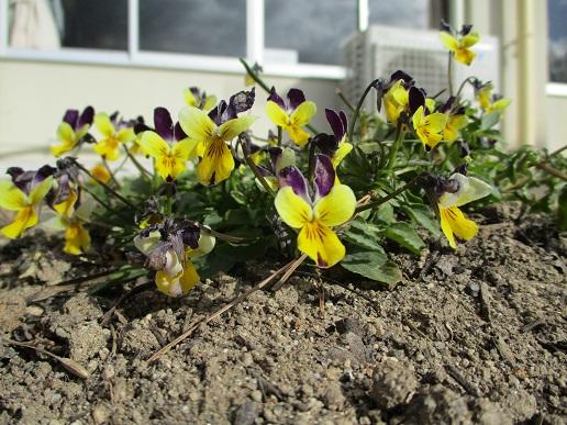 花だんのビオラやパンジーも凍った土の上で、花を咲かせながら春が来るのを待っています。