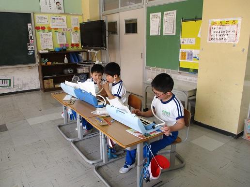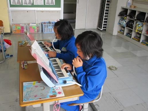 1年生は、2年生と一緒に鍵盤の指使いを覚えようと一生懸命です。