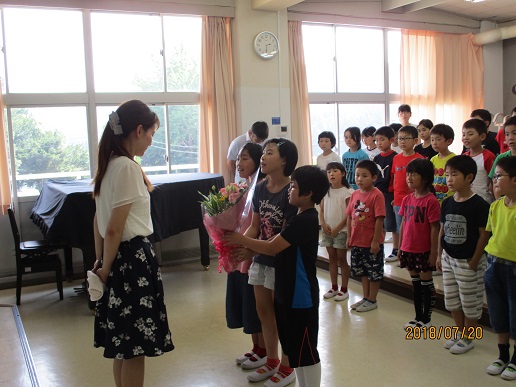 授業の後に行った離任式では、3人の4年生が代表し、感謝をこめて花束を送りました。