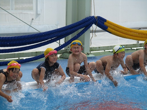 6月にプール学習を始めた頃は、怖くて水に顔をつけられなかった下学年の子どもたちも、ビート板を使って深いプールに入れるようになり、25mを泳ぐまでになりました。