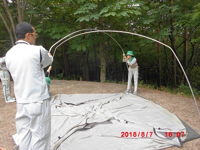 1日目は木工教室に続いて、テント張り。力を合わせて、じょうずに張ることができました。