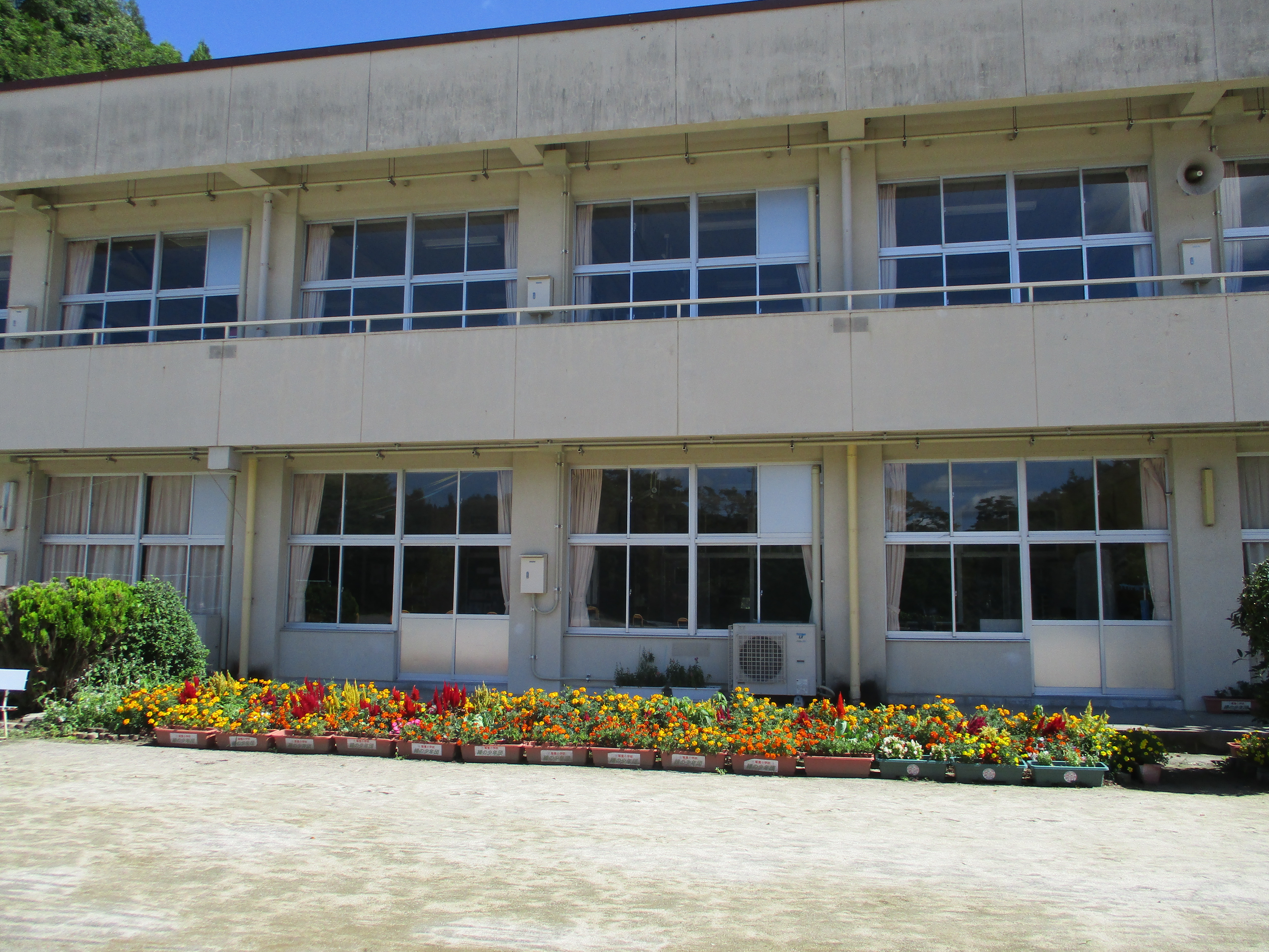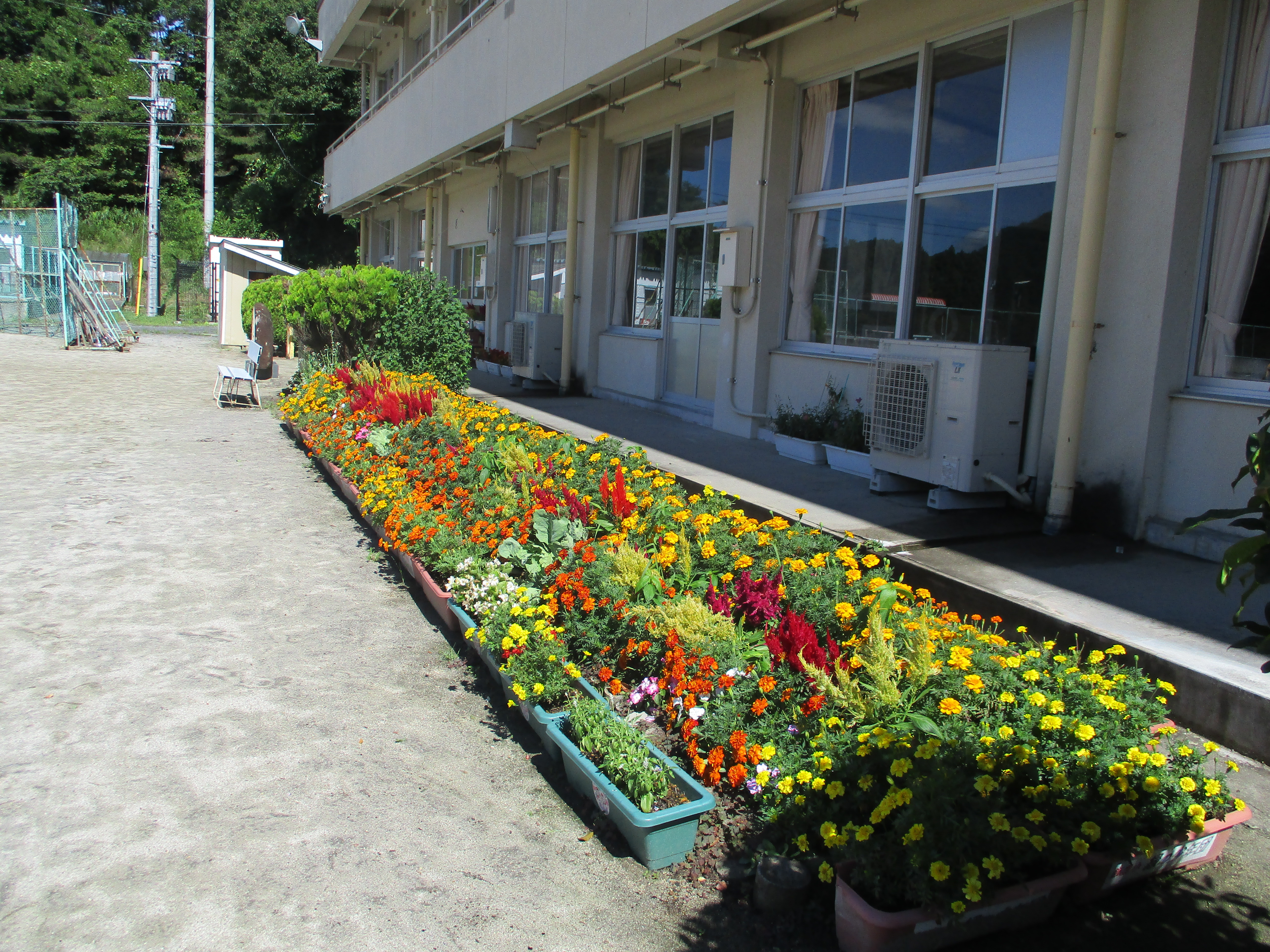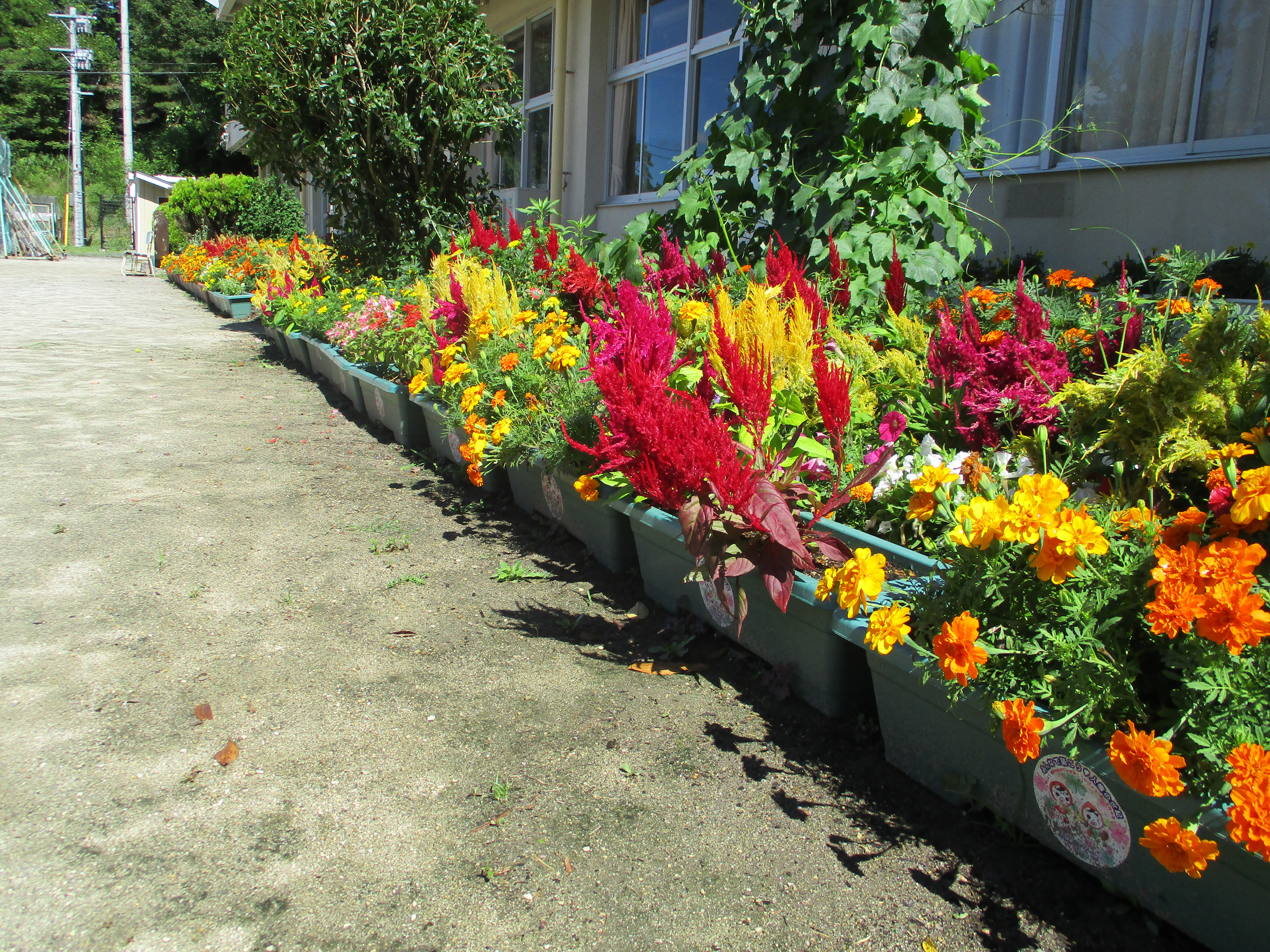 全校生が協力して植えた花壇やプランターの花々が、色とりどりの花を咲かせています。