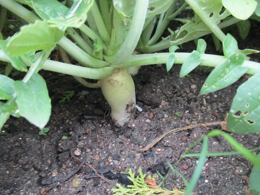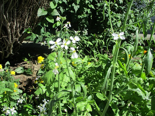 ピーマンやダイコンは白く小さな花を咲かせています。もちろん、葉の下には立派なダイコンが!