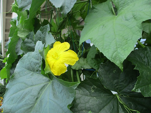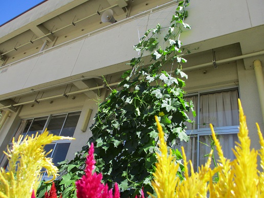 4年生が植えたキュウリやヘチマは、毎日黄色の花をさかせて、たくさんの実をつけています。