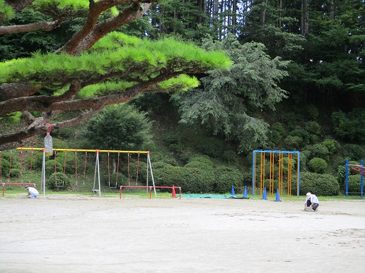 そんな中でも、おじいちゃんおばあちゃん方は手際よく土手の草を刈り、樹木の剪定をし、校庭の草をきれいに抜いていきます。その手早さは、熟練の技そのものです。たった数時間で、校庭周辺はきれいに整いました。