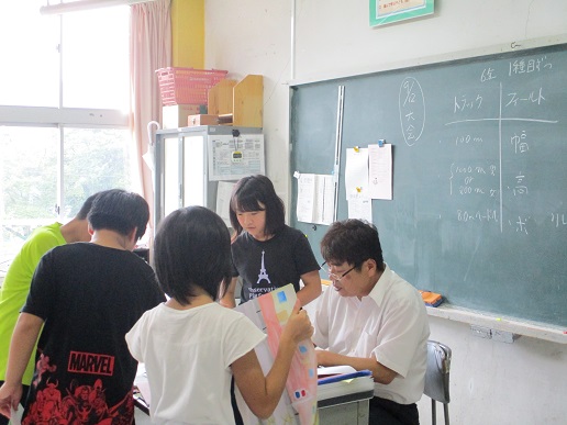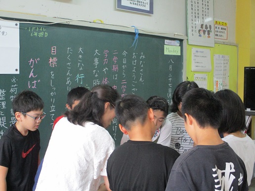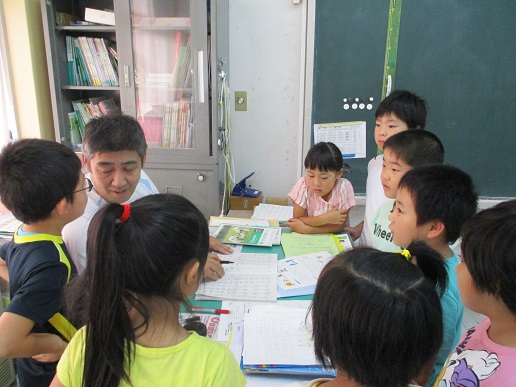 1・2年生は宿題を確かめながら、先生を囲んで楽しそうに「夏休みの思い出報告会」をしていました。