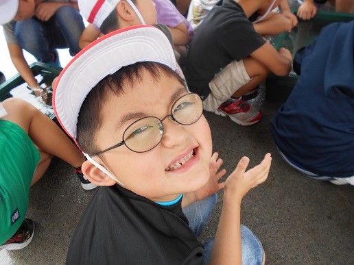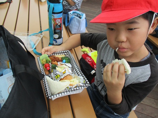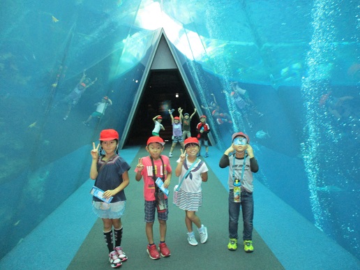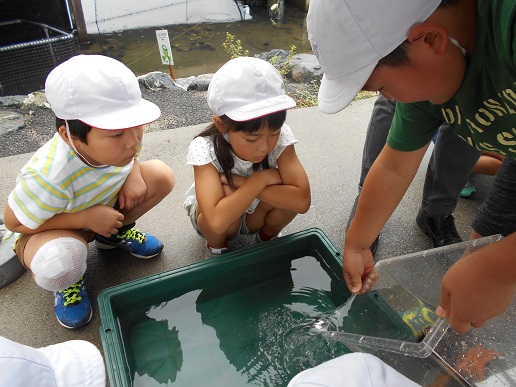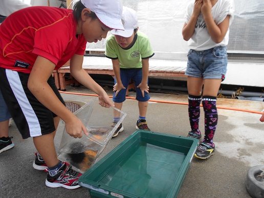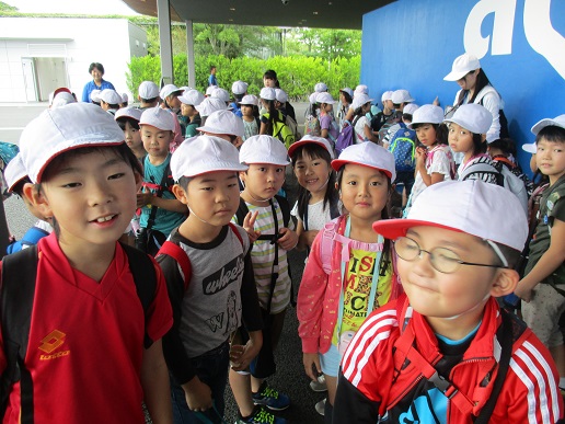 それぞれの班に分かれて、ヒトデやナマコ、ウニなどの生きものにさわりました。去年は怖くてさわれなかった子も今年は勇気を出してさわることができました。少しずつ成長していますね。そして、たくさんの海の生きものを見たり、お弁当を食べたり、展望台に登ったり、3時間はあっという間に過ぎてしまいました。