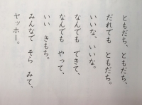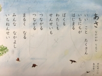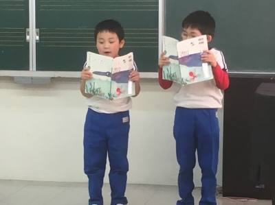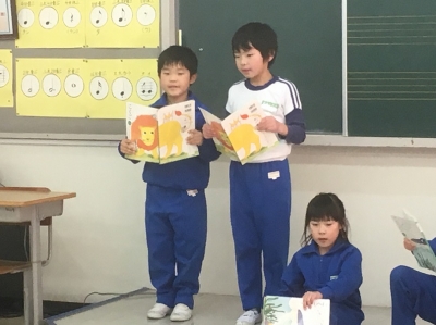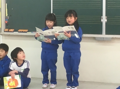 2人ずつ、3つのグループに分かれ、教科書で学習した「あさ」「ともだち」「てんとうむし」という3つの詩を発表してくれました。場面ごとに分担したり、声をそろえて読んだりと工夫した発表はとてもかわいらしかったです。