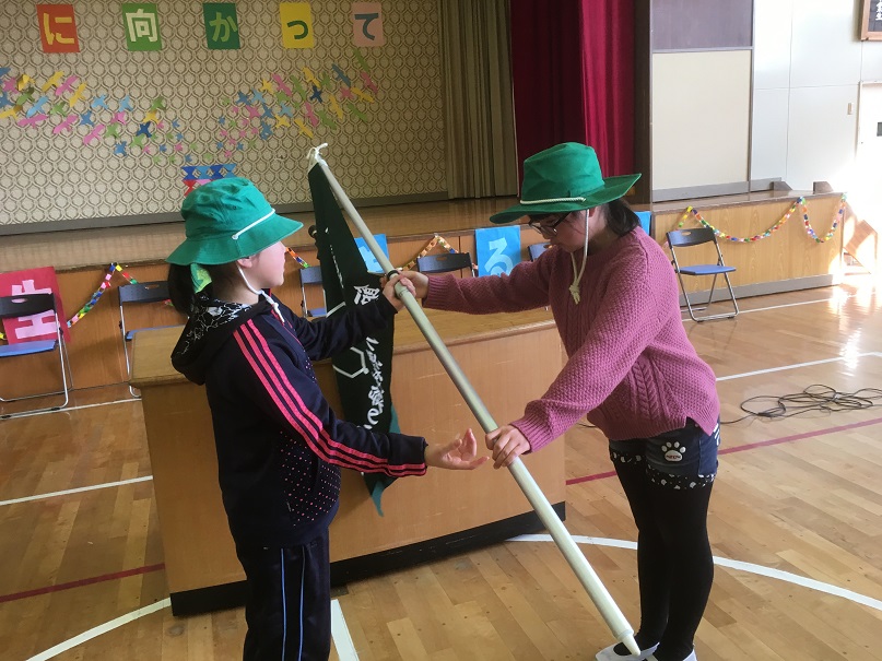 6年生の団長から5年生の新しい団長へ団旗が、6年生から4年生へ帽子が引き継がれました。最後に、新しい団長が飯豊小学校緑の少年団の伝統を引継ぎ、さらに発展していくための決意を表明し、無事終了しました。