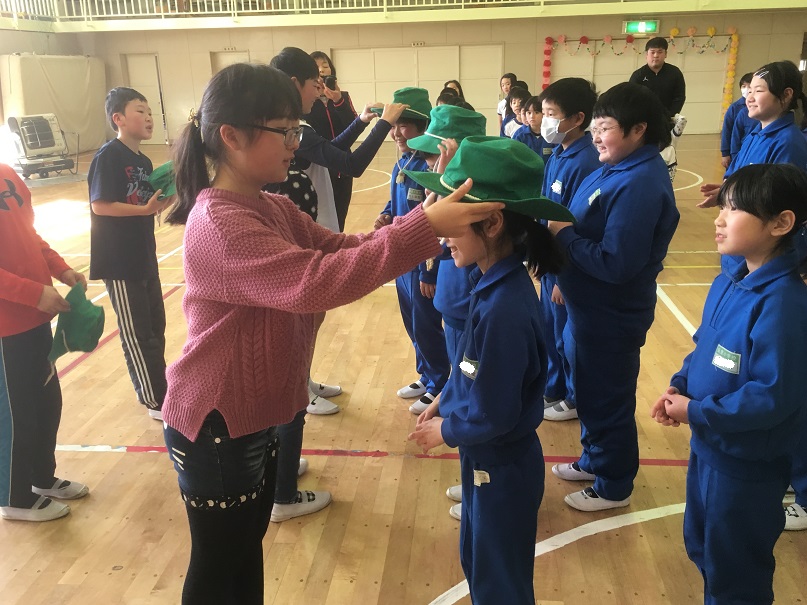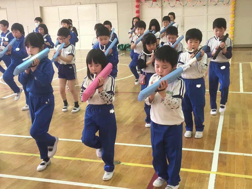 6年生の主指揮から5年生の新しい主指揮へ、指揮杖と帽子が引き継がれました。新しい編成での演奏では、これまで練習してきた成果を発揮し、6年生が安心して見ていられるような演奏を披露することができました。鍵盤ハーモニカでの演奏に初めて加わった1年生もしっかりと演奏できていました。