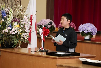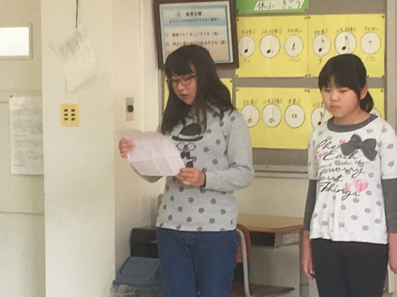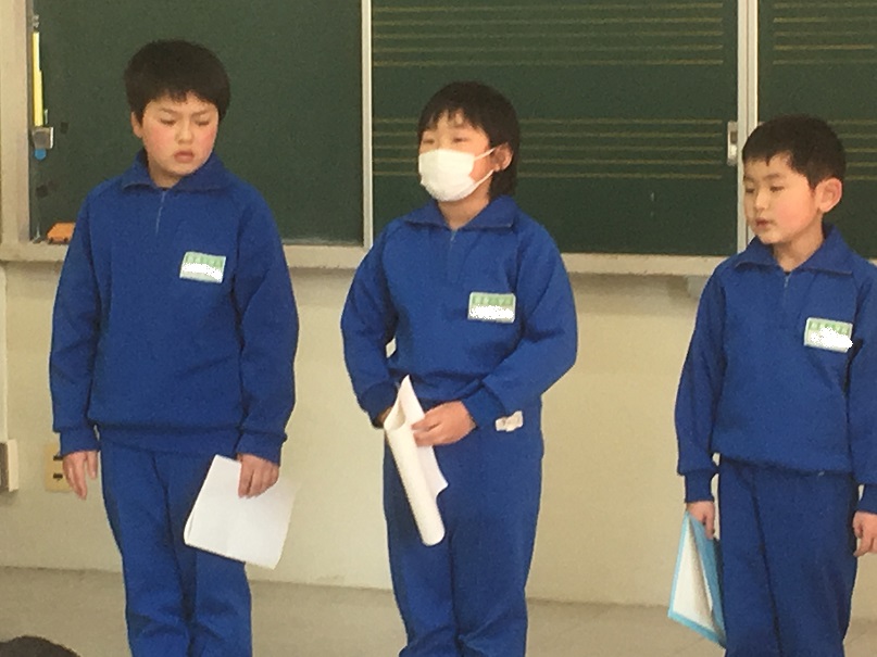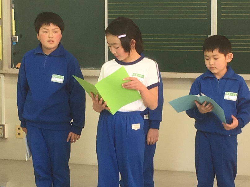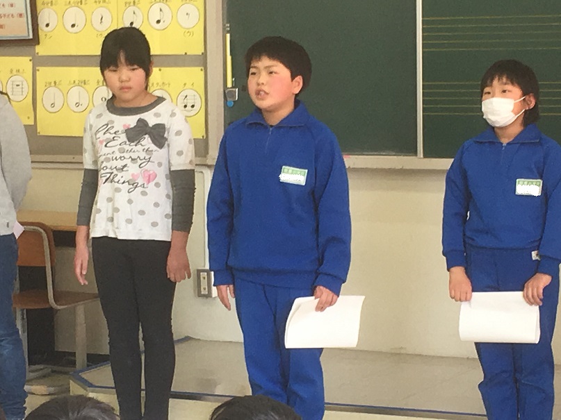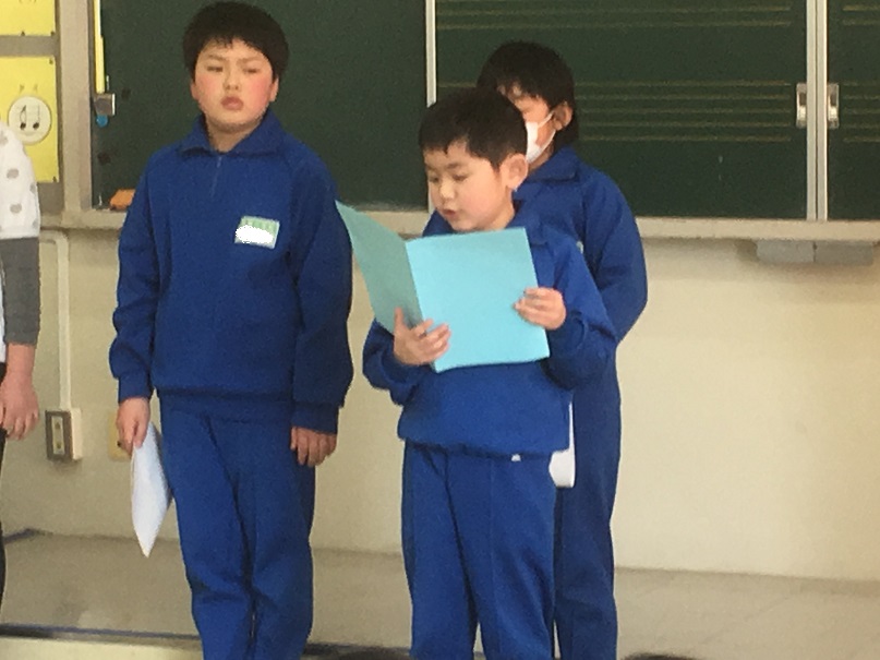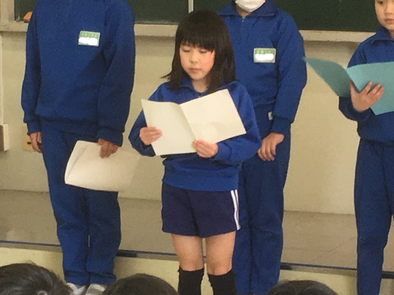 各学級から7名の児童が代表として発表してくれました。「字が丁寧に書けるようになった」こと、「友達や先生の話が聞けるようになった」こと、「代表委員としてがんばった」ことなど、それぞれの児童ががんばってきたことをしっかり振り返ることができたようです。中には、来年度、さらにがんばりたことについても触れている児童がいました。これからも児童のさらなる成長を期待していきたいと思います。