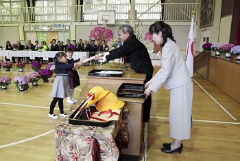 入学式では担任の先生の呼名に元気に返事をして、たくさんの教科書を校長先生からもらいました。これからの勉強が楽しみになったかな。