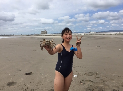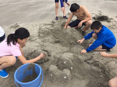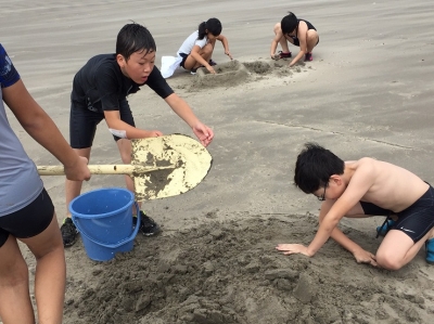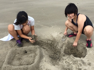 海岸の砂を使った芸術作品作りがスタートしたようです。海水で砂を固めて、形作ったり、積み上げたり……。でも、そのような中で、大きなカニを捕まえた子もいたようです。