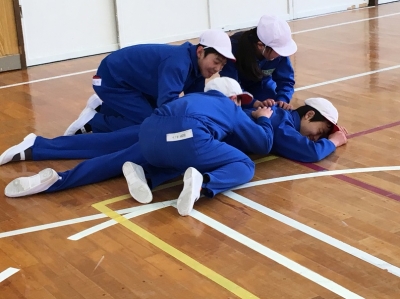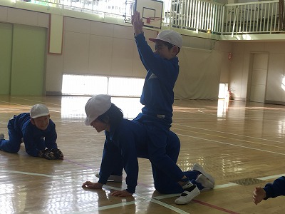 5・6年生は、ゲームを通した即興的表現運動に取り組みました。この2枚の写真は、「ライオン」からイメージした動きを表現している様子です。左側は獲物に群がるライオンを、右側はサーカスで火の輪をくぐるライオンを表現しています。