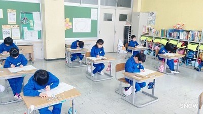 初めての学力テストに取り組む1年生の様子です。みんな一生懸命問題に取り組んでいますね。