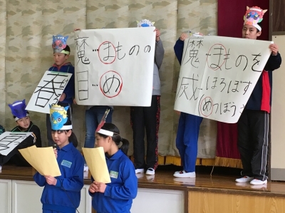 節分は、本当は4回(春夏秋冬)あること、豆まきは、「魔(ま)物を滅(め)亡させる」や「魔(ま)物の目(め)に当ててやっつけた」からきている説があること、節分には「恵方巻き、こんにゃく、鰯、そば、くじら」を食べるとよいという説があることなど、自分たちで調べたことを発表していました。