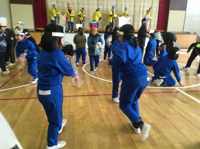 フロアーにいる子どもたちは、まかれた豆を一生懸命拾っていました。きっと、たくさんの豆を持ち帰ったことでしょう。