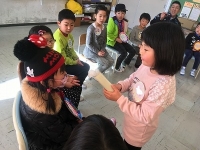 今日、聞かせていただいたお話は、「わらぶき屋根の家に住んでいるおじいさんが飼っている馬のおしりから出た馬糞にたかっていたはえを食べようとしているにわとり・・・・の様子を全部見ていたお地蔵さん。と積もり積もっていく『積もりばなし』」。『カエルとうさぎとサルの餅つき』。『おおややえへん』の3つ。 どのお話もとてもおもしろく、子どもたちは真剣に聞いていました。