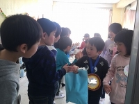 右側は、ちゃんとしたプレゼント(ぴょんぴょんうさぎ(遊んだ物とはべつのもの)と、魚釣りゲームのできるセットが入っています。)を渡しています。一緒に遊んだおもちゃも、急遽あげていました。新しい1年生が、とても喜んでくれたからだそうです。