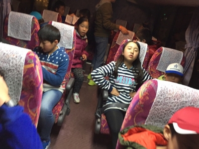 バスに乗って、スカイツリーへ向かう子どもたち、疲れもちょっと見られるようですね。