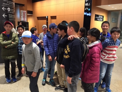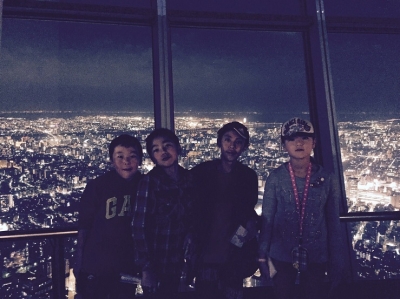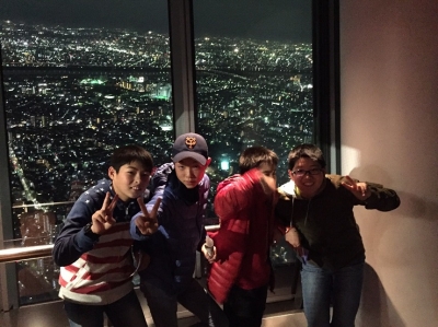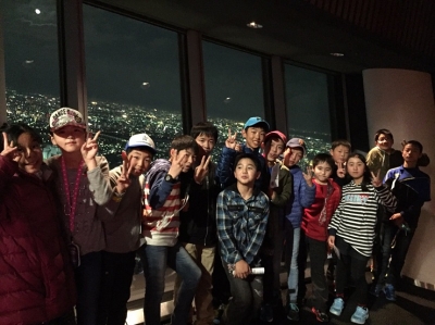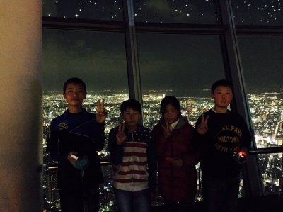 展望フロアーでの記念写真。子どもたちの後ろには、東京の夜景がしっかりと写っています。実際の景色は、もっとすばらしいものだったことでしょう。本当に、うらやましい限りです。