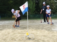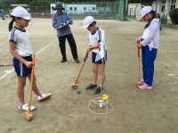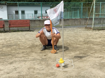下学年グループの様子です。6月に行った第1回の時には、構え方も、打ち方も、ルールも分からず、戸惑う様子が多かった子どもたちでしたが、今回はもう慣れたものです。時間内に、予定していた5ホールを難なく済ませ、追加2ホールを回るほどの上達ぶりでした。しかも、4人の子どもたちがホールインワンを達成しました。