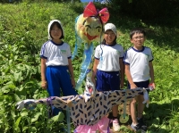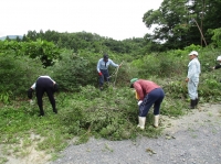 4年生が、夏休みを前に、理科の学習で育てている大豆畑の草取りとかかしの設置を行いました。