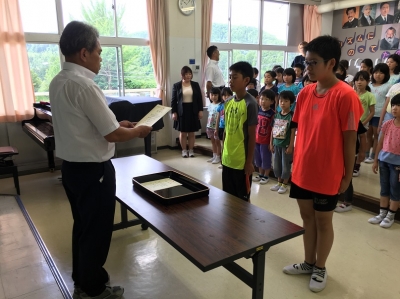 また、7月3日に行われた全国小学生陸上競技交流大会福島県選考会に出場した6年生児童2人に記録証が授与されました。この2人の活躍は、特設陸上部で活動している4・5・6年生にとって、大きな励みとなりました。