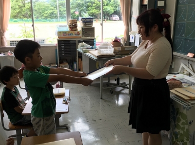 終業式の後、1年生教室をのぞいてみると、早速、通知票を渡していました。