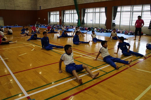体育館に到着するなり、町内の各小学校の子どもたちがすでに準備運動をしていました。