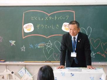 佐藤課長さんから読書で身につく力の大切さや、小野町の取組みについて1年生にお話があり、読書スタートバッグが一人一人に手渡されました。