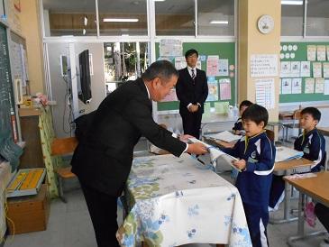 15日(金)、佐藤課長さんと文化の館の西牧さんに来校いただき、読書スタートバッグ贈呈式を行いました。