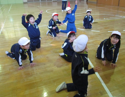 わいわいタイム、なりきりタイムで、自然に笑顔になる低学年の子どもたち。