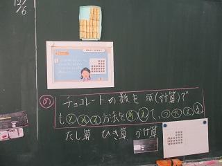 2年生は、算数の授業です。勉強したかけ算九九を使って、チョコレートの数を計算しました。
