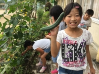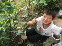 大きく育ったキュウリを見つけては、みんな同じくらいの数になるようにゆずり合いながら、
