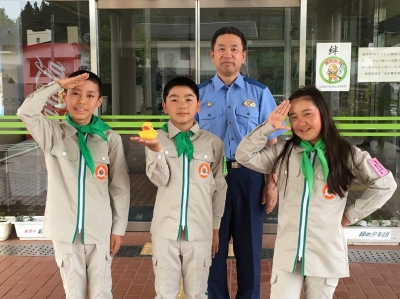 今年は、緑の少年団の制服を着て、配付活動を行いました。
