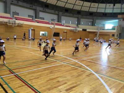 1年生は初めてのシャトルラン挑戦です。最初はゆっくり走っても間に合うくらいの間隔なのですが、20m先をめざし最初から全力疾走! 少しずつ、スピードの調整ができるようになりました。
