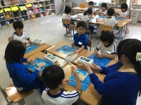 窓から入る日光をカラフルにしようと、透明の卵パックやペットボトルに色を付けて、自分だけのステンドグラスを作っていました。