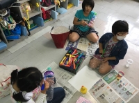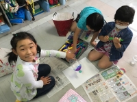 ナイロン袋に様々な色の花紙を入れたり、色紙を切り取ったりしながら、色鮮やかなマスコットを作っていました。