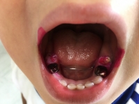 歯垢染め出し液を使って磨き残しをチェック。しっかり歯を磨いたつもりでも、歯と歯茎の境目や奥歯に磨き残しがあることを再確認しました。