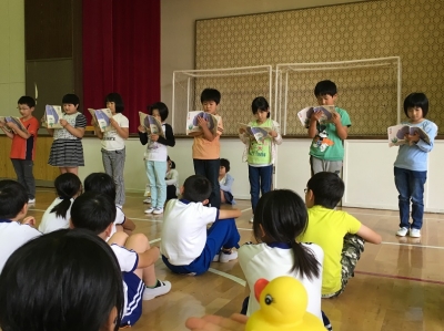 本日、集会活動で音読発表会(2・3年生)を行いました。