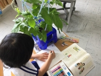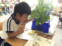 先日、1年生は国語科 「おおきく なった」 の学習で、育ったあさがおを観察し、自分の手や体と比べて大きさや高さを表したり、触った感触を言葉で表したりしました。大きく育ったあさがおに、改めて驚いている様子もありました。