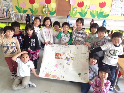 昨日のブログ(給食の学習と春探し)で描いた絵を使って、「がっこうの しょくぶつまっぷ」 を2年生と一緒に作りました。